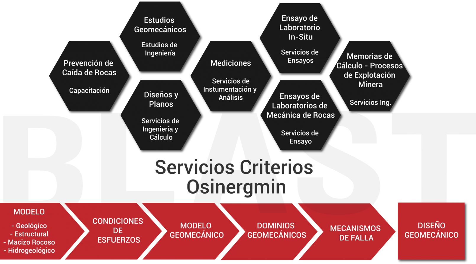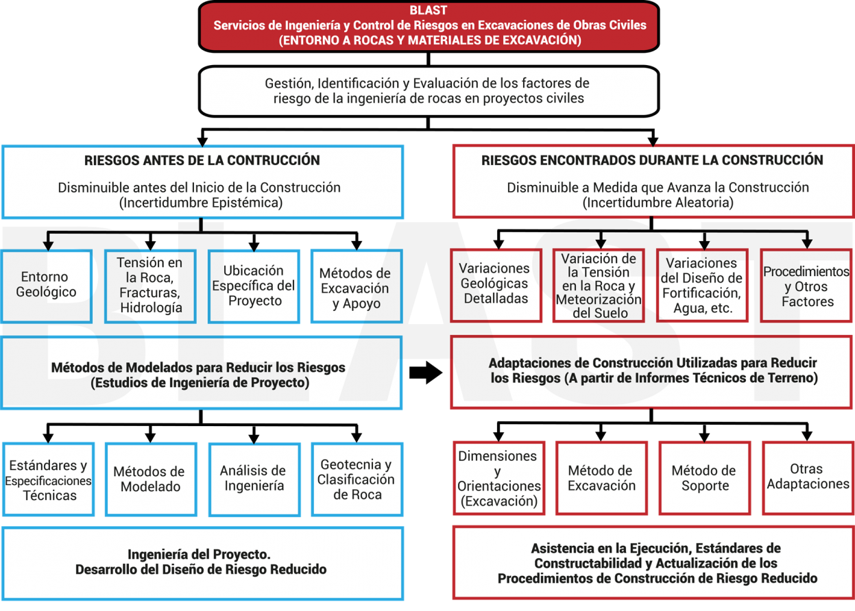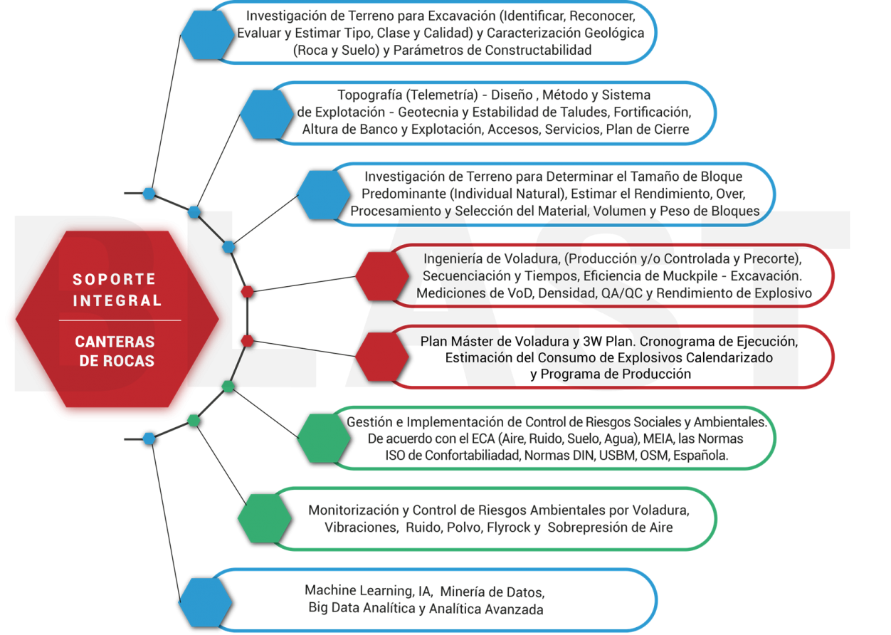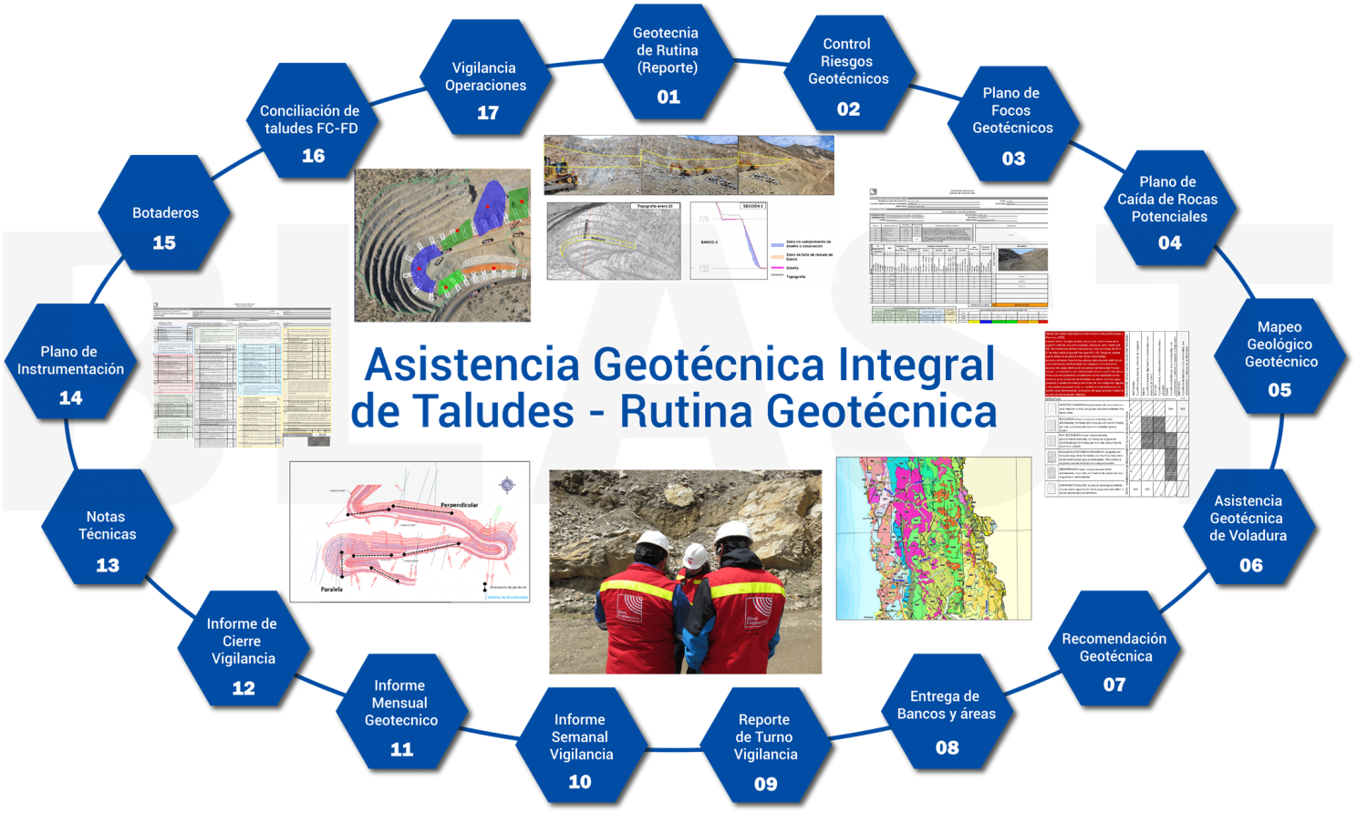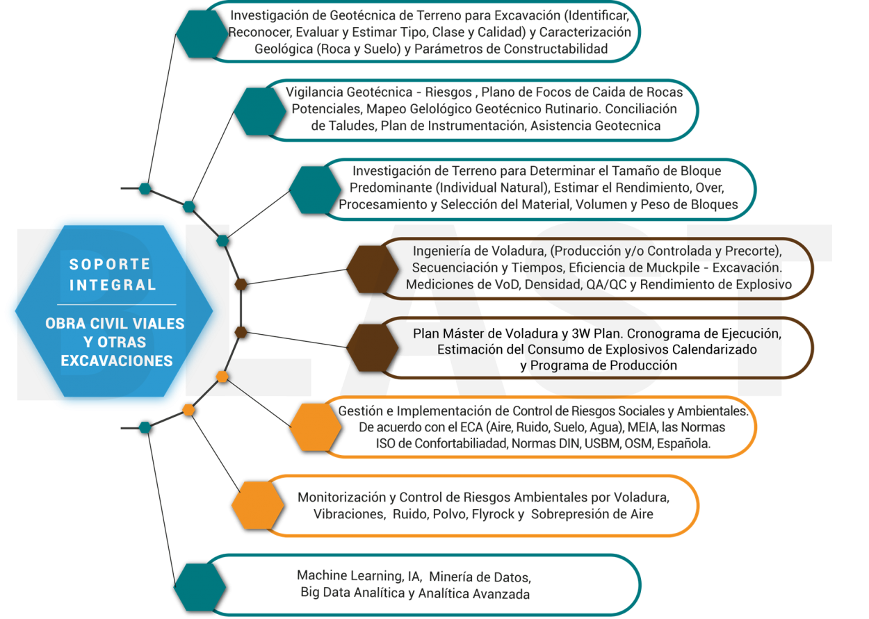 La base del éxito de cualquier proyecto de ingeniería comienza con la prospección geológica (regional y local) detallada, las investigaciones geológica-geotécnicas del terreno (y subsuelo) acorde al proyecto o con la mesurada caracterización litológica-estructural de las formaciones geológicas susceptibles sobre el que se explotará, excavará, construirá una obra de ingeniería, se mejora o se explorará. Blast Engineering S.A.C. como uno de los principales proveedores de servicios técnicos de ingeniería y consultoría técnica para la minería y proyectos civiles de la región, instituyó su división de Geociencias Aplicadas para realizar estudios e investigaciones con base geológica y sus ramas de ingeniería, asimismo, cuenta este departamento cuenta con instrumentación y equipamiento de vanguardia y un equipo humano selecto de ingenieros multidisciplinarios que lo conforman, geólogos, geofísicos, geotecnistas, mineros, estructurales, ambientales, electrónicos y civiles. La división de Geociencias de Blast Engineering S.A.C. esta anexada ao a una red de laboratorios acreditados, y validados en los países de Latinoamérica y Centroamérica donde nos desenvolvemos, complementando un servicio de primer nivel para nuestros clientes.